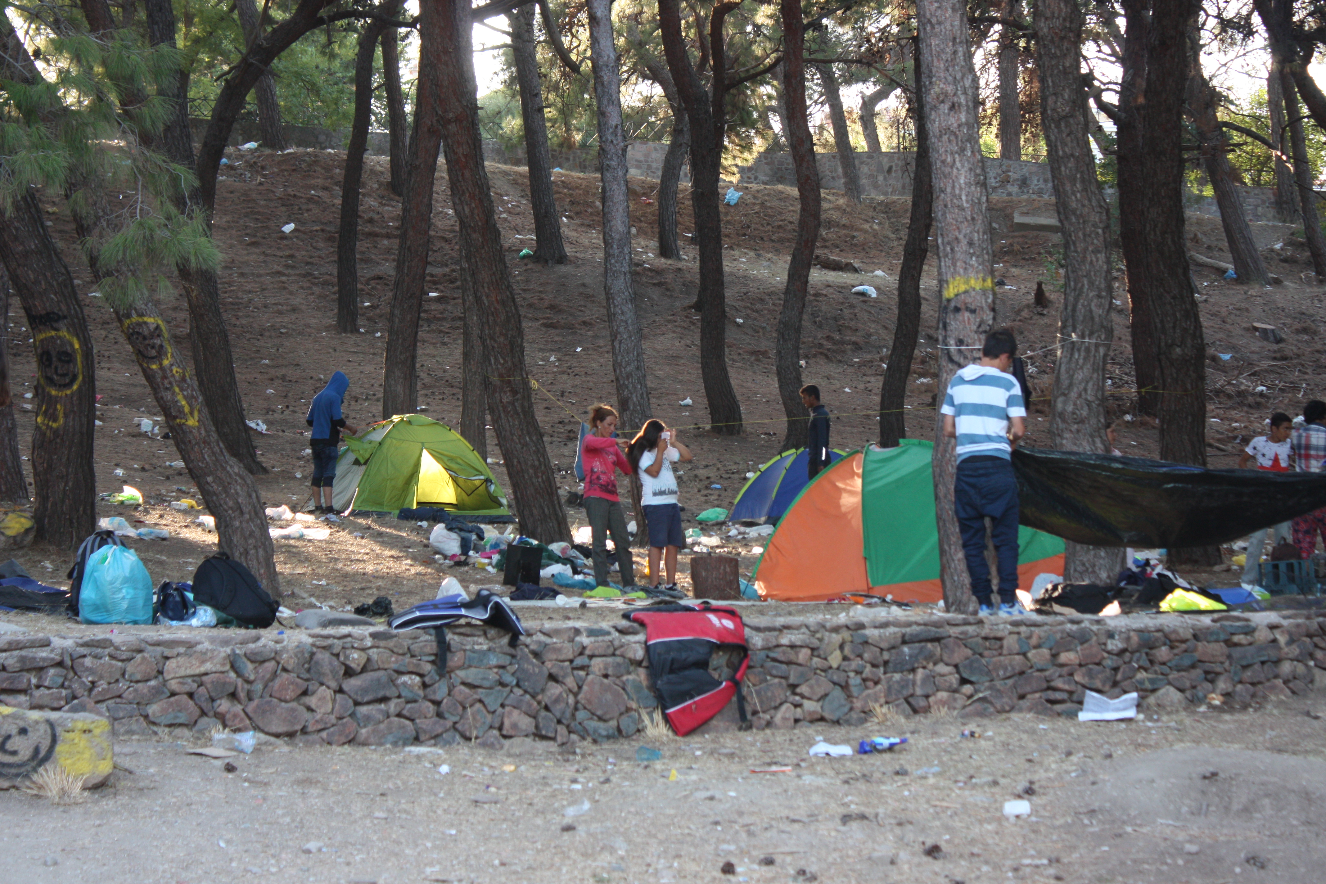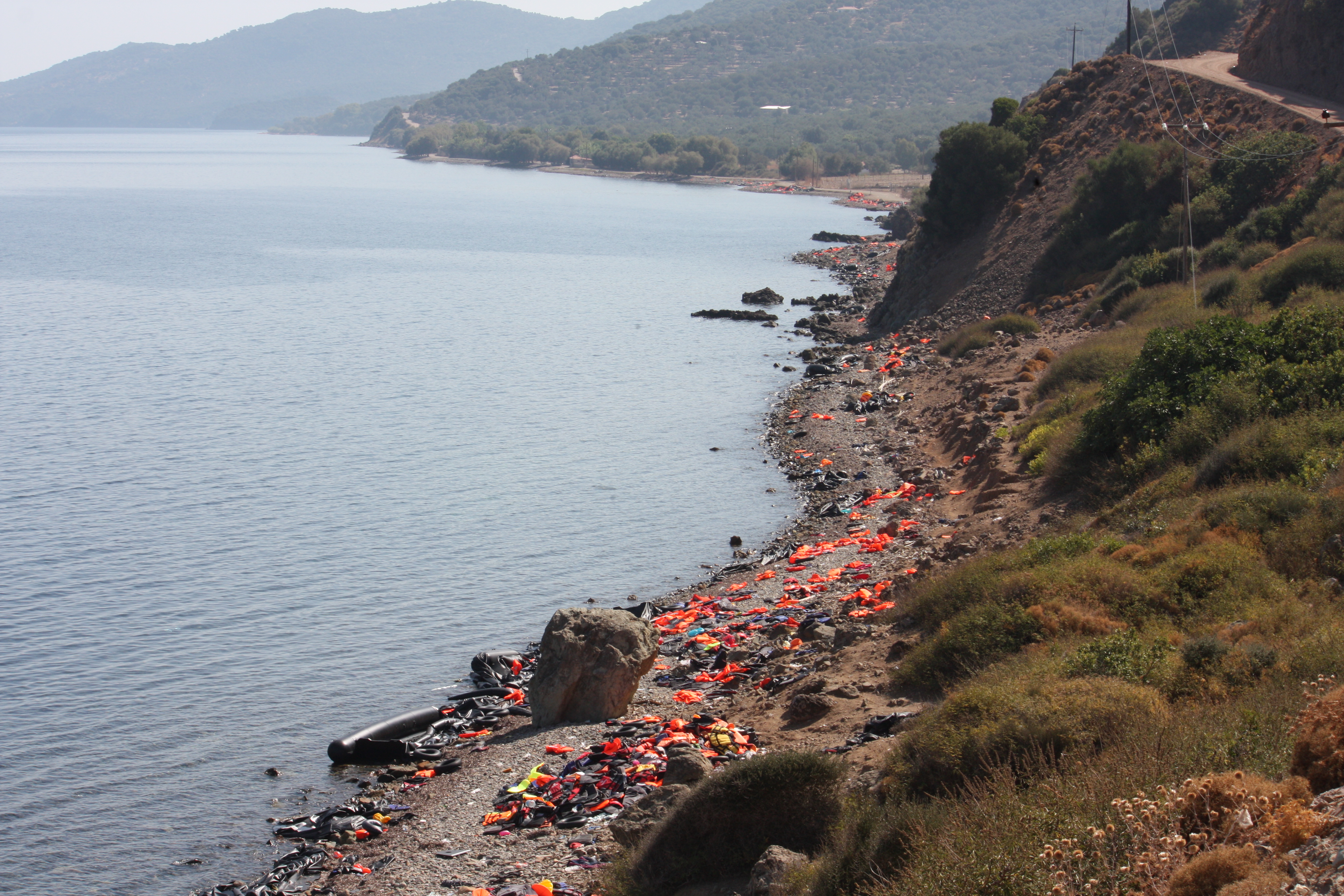 On the road from Molyvos to Mytilene, the capital of Lesvos, enormous piles of fluorescent orange lifejackets, deflated dinghies and tire tubes litter every beach. In some places, the pebbles disappear altogether under the sheer volume of discarded materials and locals pick their way through the detritus for their daily swim. Scavengers waste no time in taking anything valuable, sometimes trying to rip away outboard engines from dinghies before they have reached shore. I see all the places we visited on holiday, except now the beaches we swam on are peppered with lifejackets and the trees we relaxed under are posted with signs in Arabic and illustrations asking people not to litter.