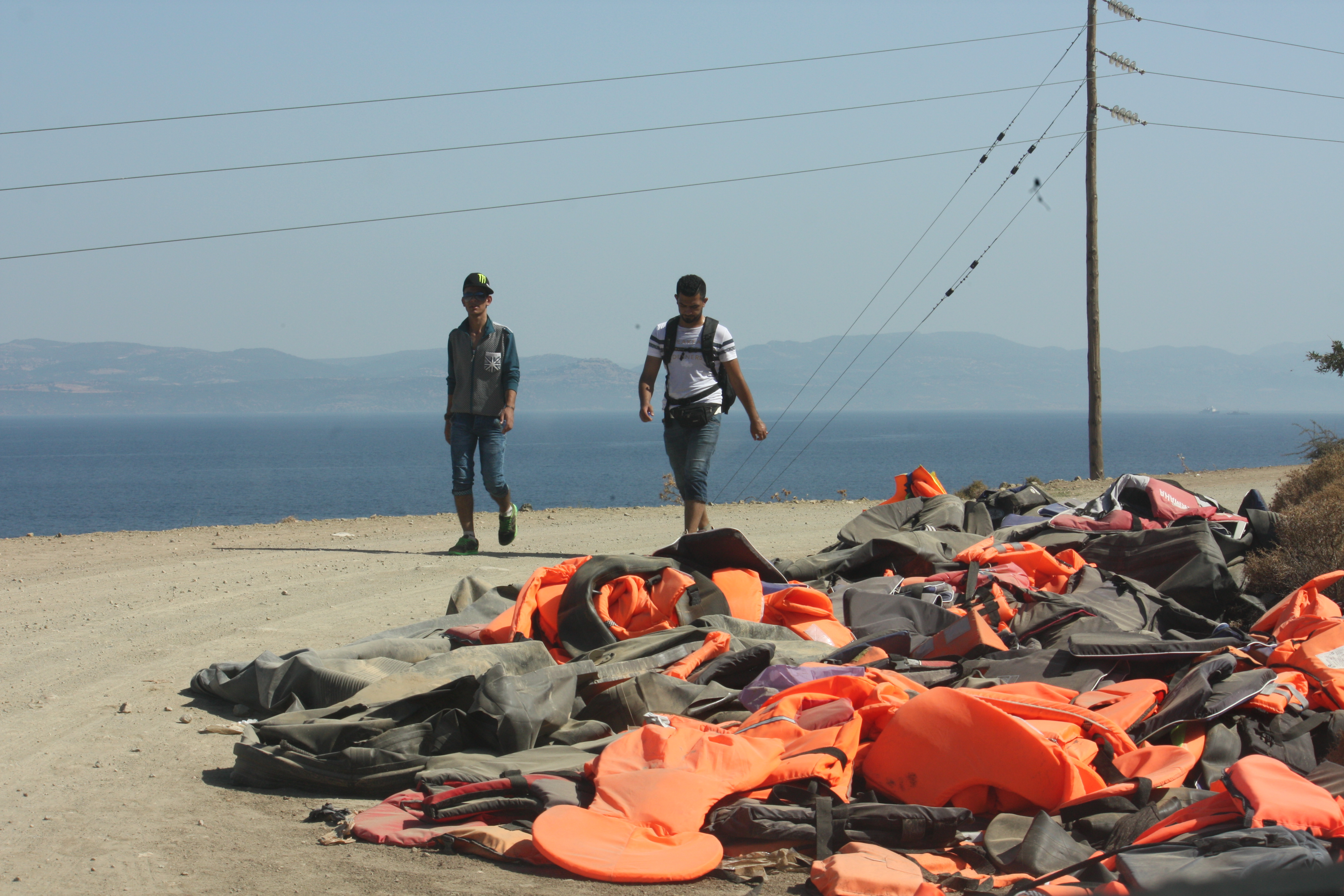 Refugees walk past discarded lifejackets on the road from Eftalou to Mytilene